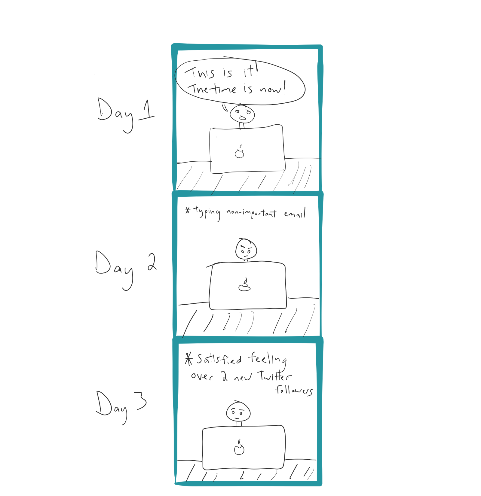 Instead, we wait. We bookmark those how-to articles for later. We put our blog ideas in a folder somewhere in Evernote. We sketch out a landing page for our app idea for when we should build it. We wait for the perfect co-founder, the right time, until we hit 3000 followers, until we get that project finished until we hit inbox 0.